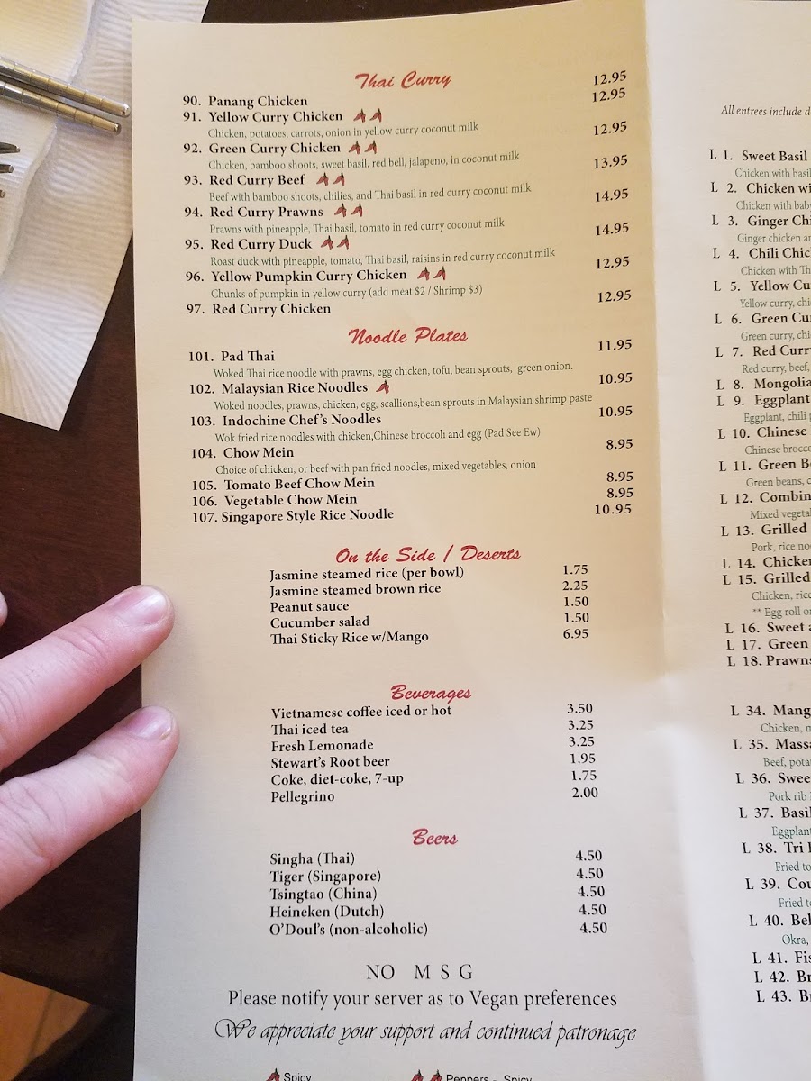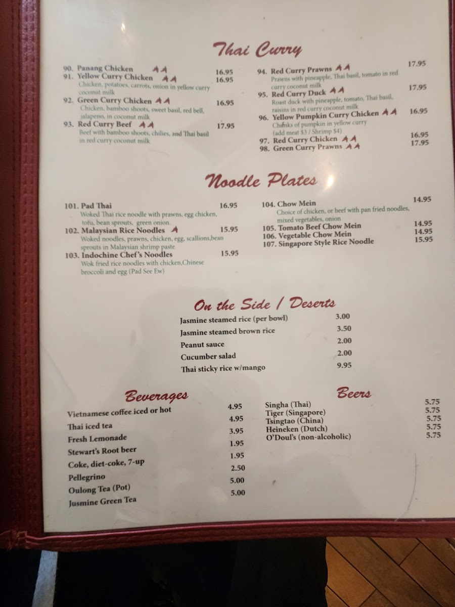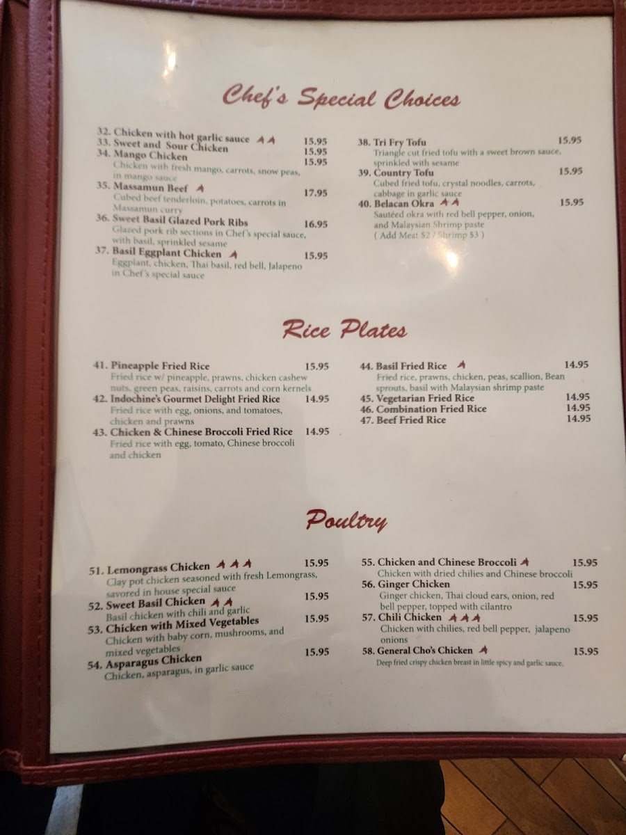 Fish filet, red bell, jalapeno, & Thai basil in panang curry & coconut milk.